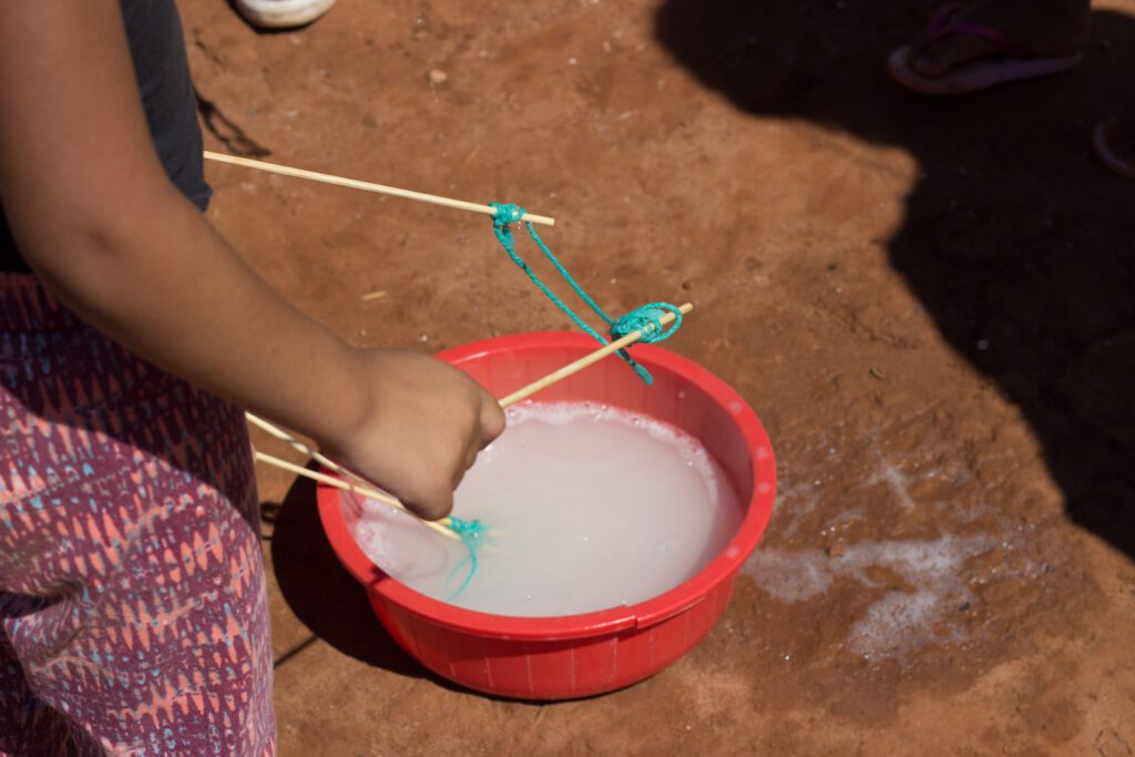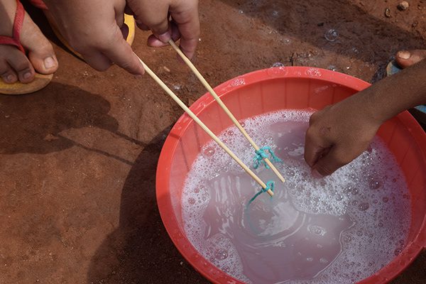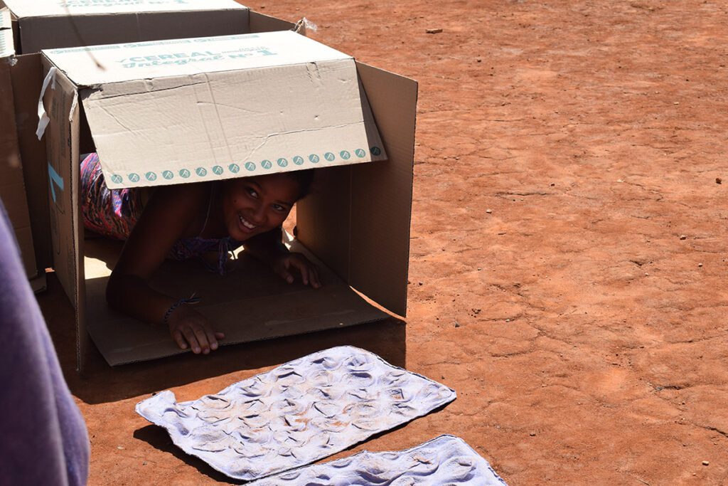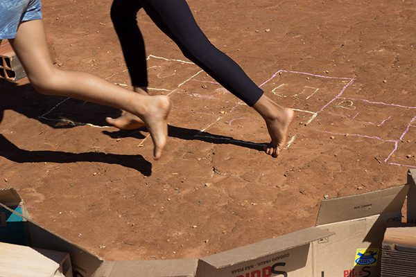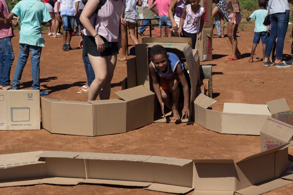 Os nossos propósitos educativos e culturais se cruzaram com os do ABC e, numa manhã de sábado, realizamos experiências lúdicas com a turma a partir de materiais reciclados. Com plástico, papelão, metal e materiais de construção, construímos um grande labirinto, além de outras brincadeiras. O pebolim e as bolhas de sabão gigante ganharam a criançada.
