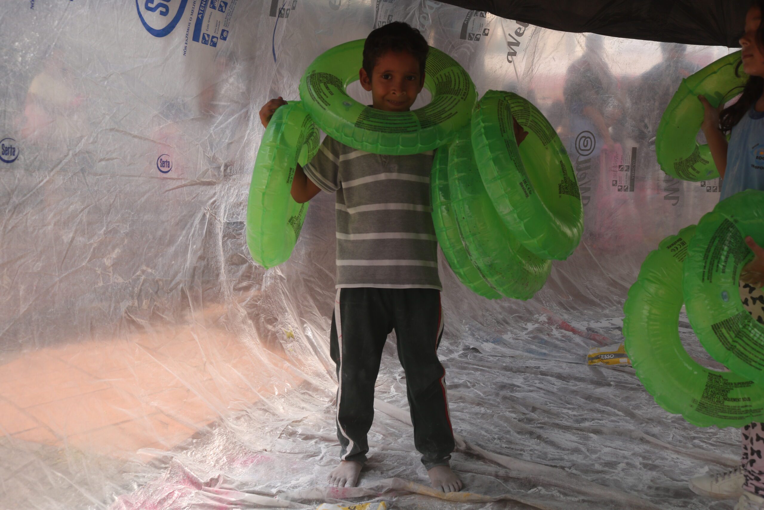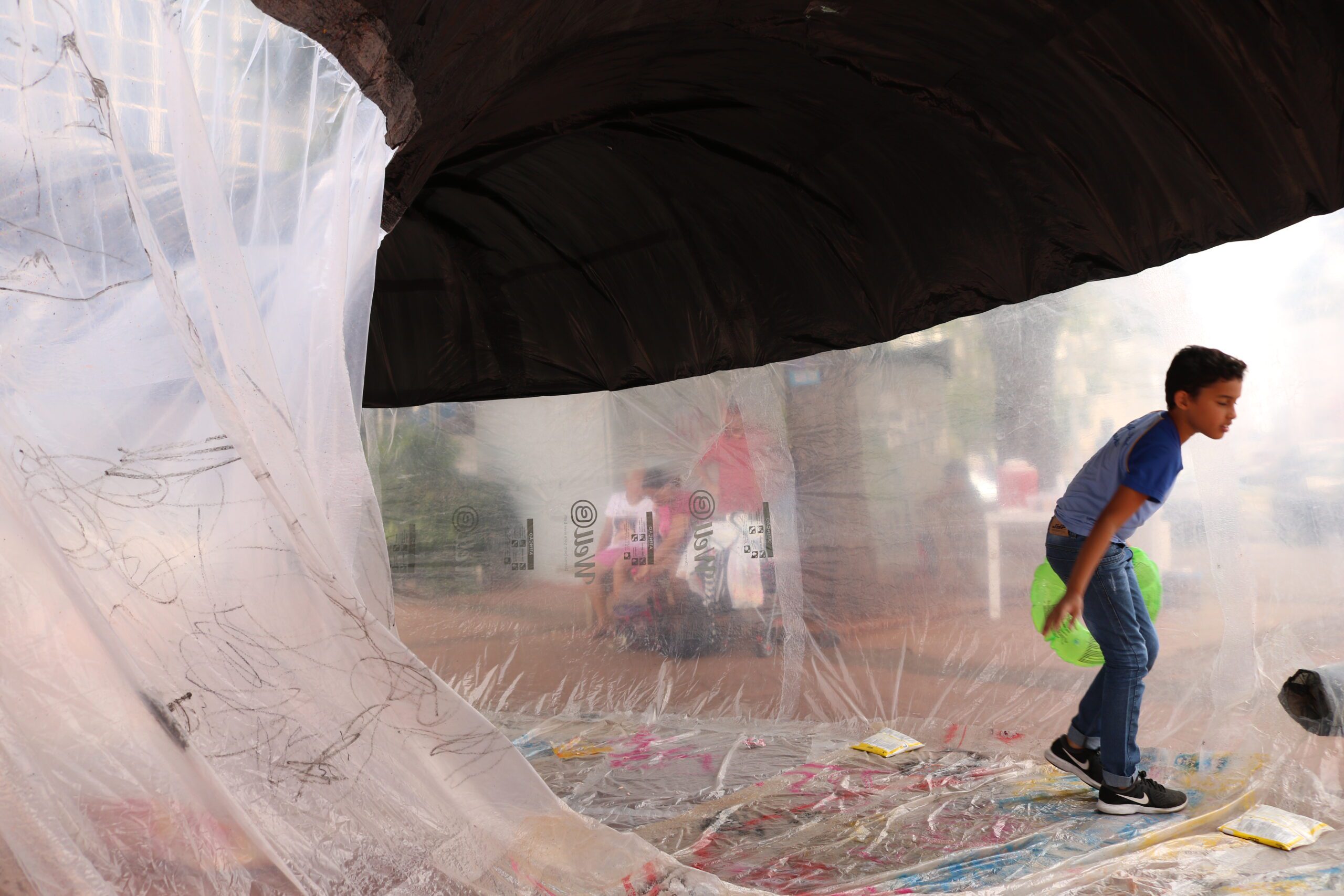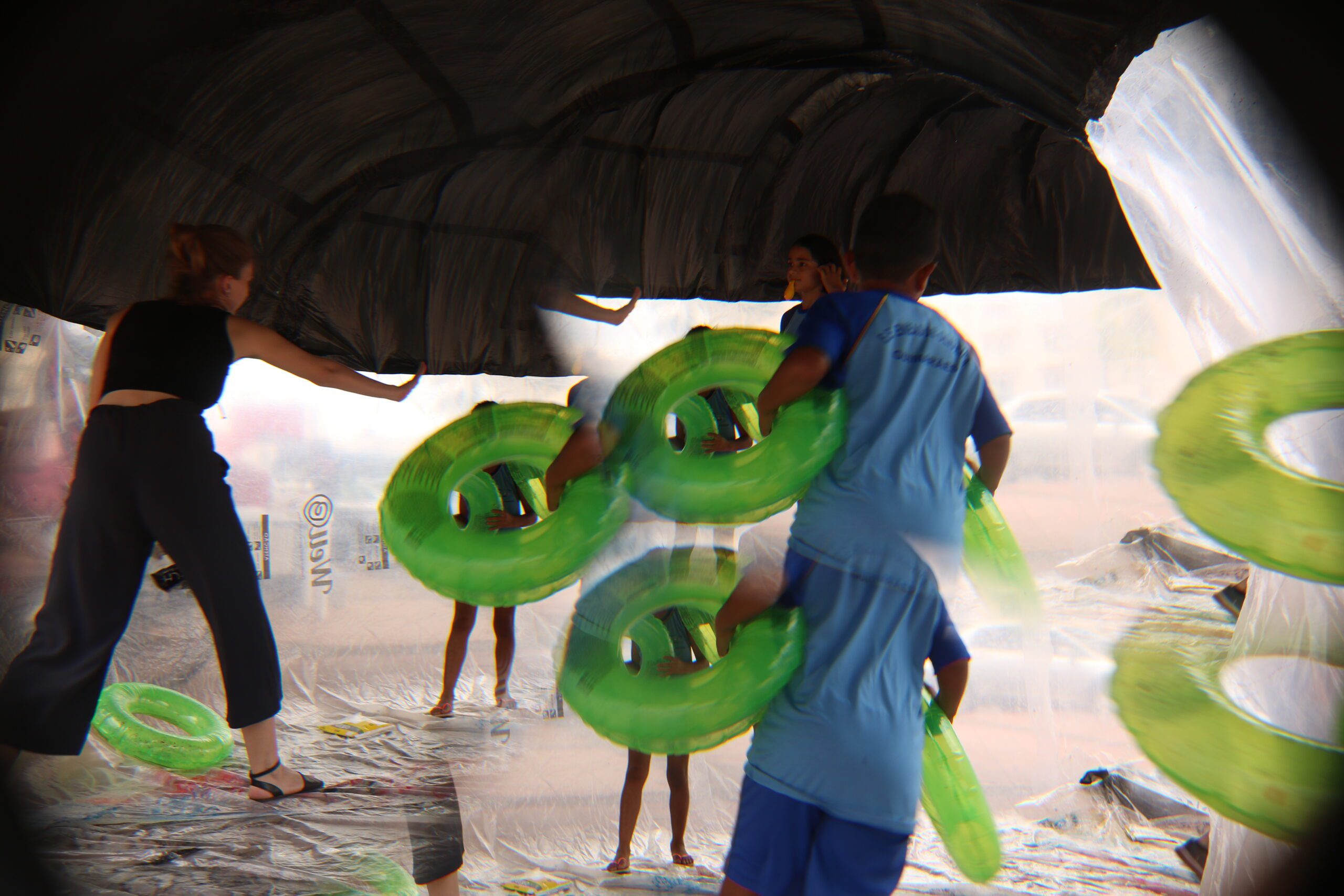 O inflável, em formato de biscoito/pudim/cogumelo, foi construído com plásticos descartados de uma loja de colchões, sacos de lixo pretos e outros plásticos reciclados que haviam sido desenhados pelas crianças na oficina de movimentação, realizada em outubro de 2018.