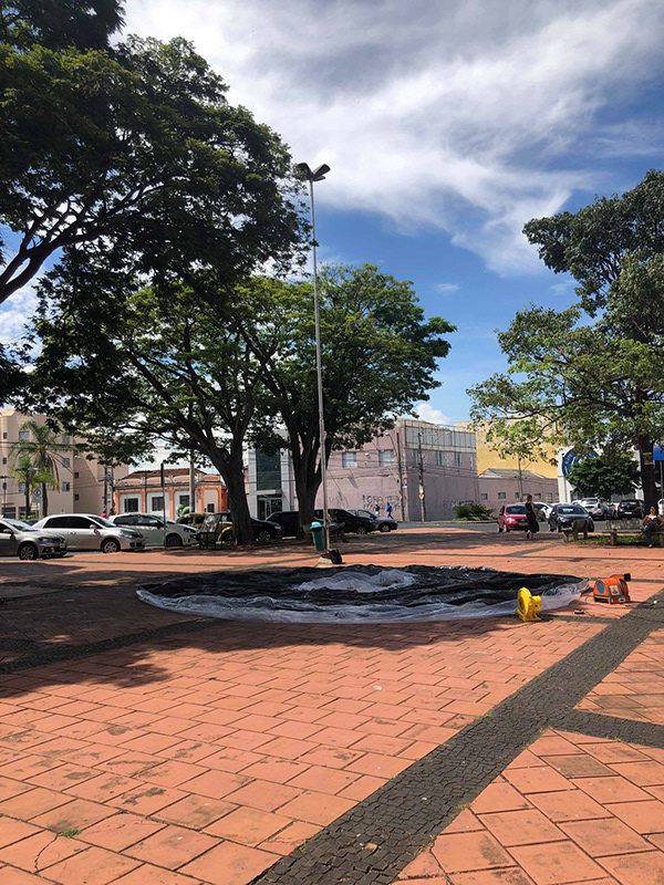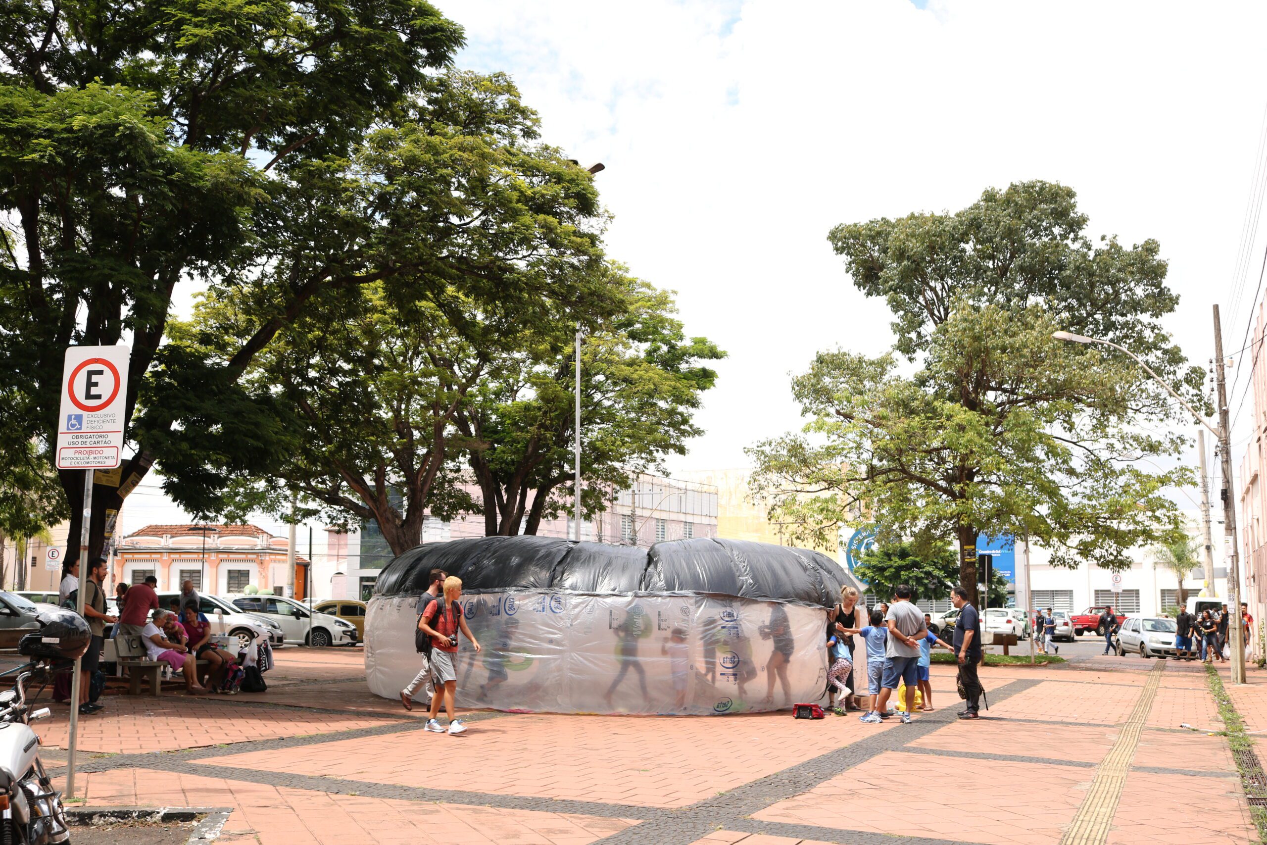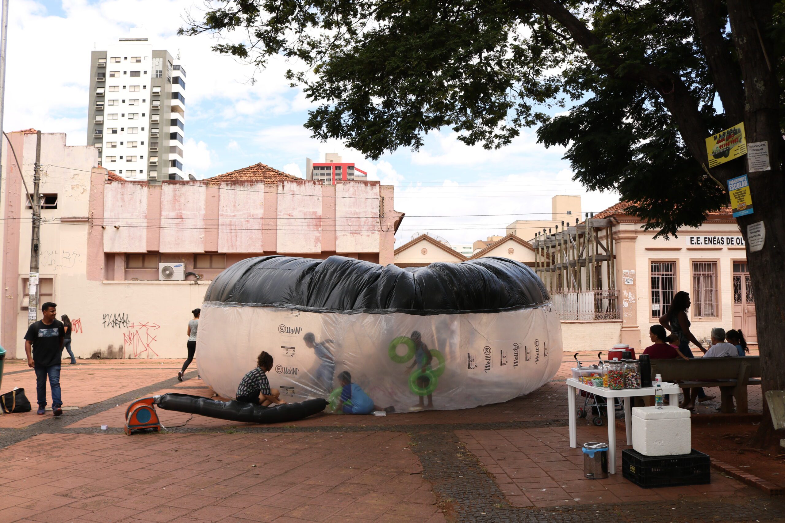 A instalação, realizada numa manhã de sexta-feira, foi feita na praça Dr. Duarte – em frente à Escola Estadual Enéas de Oliveira Guimarães. As crianças e transeuntes que passavam pela praça puderam conhecer e interagir com o ambiente pneumático, além de outros objetos preenchidos de ar, como bóias e balões.