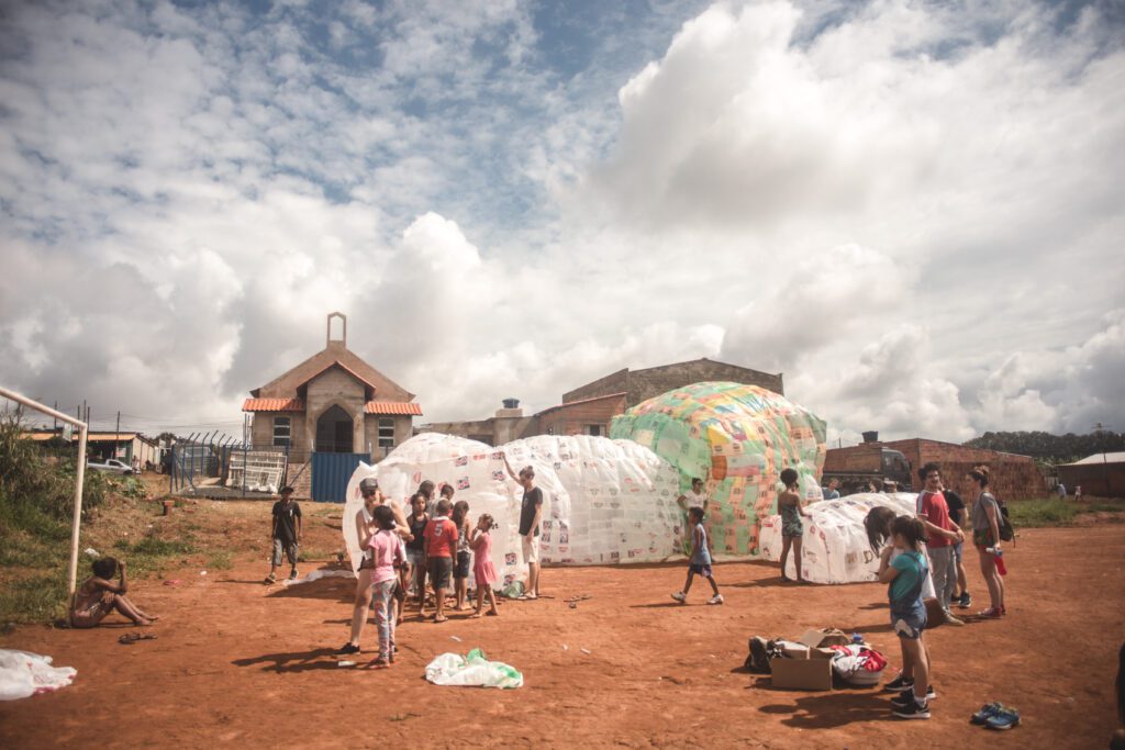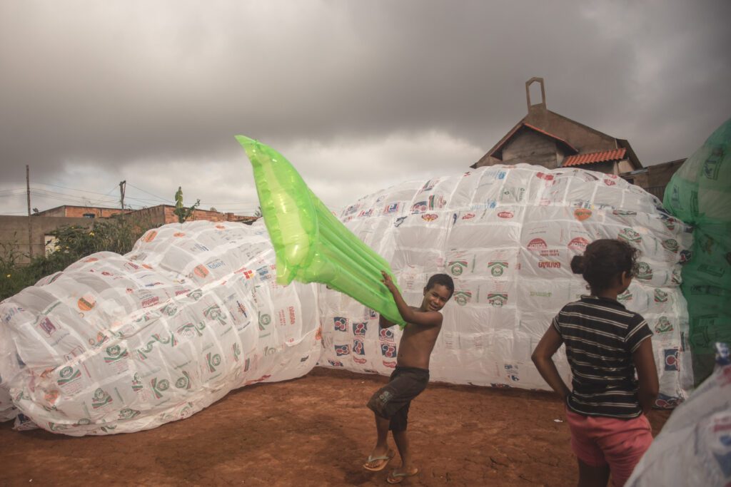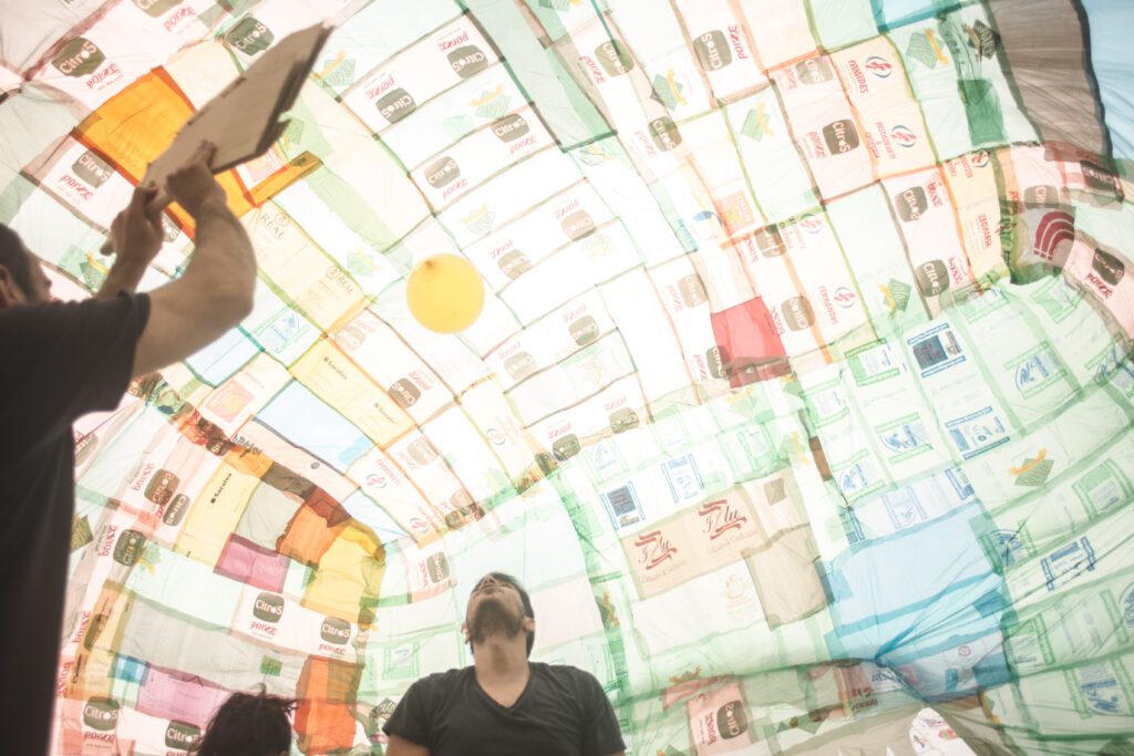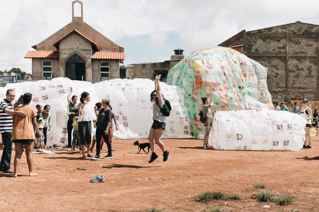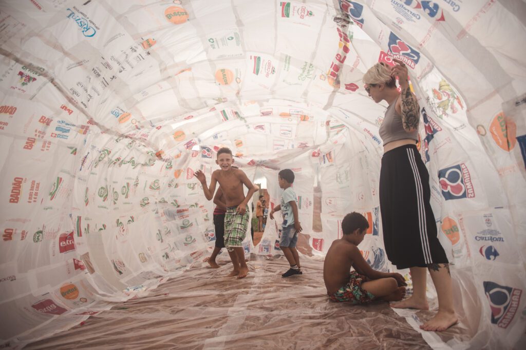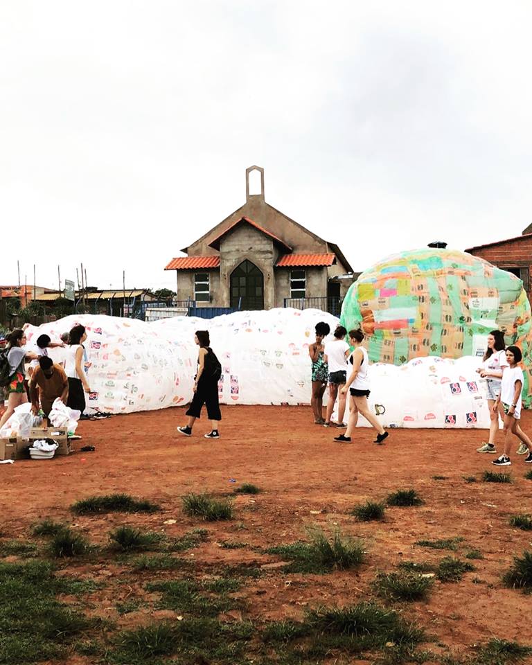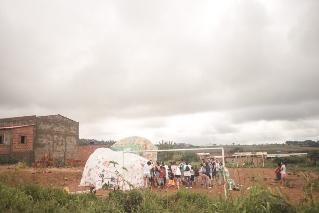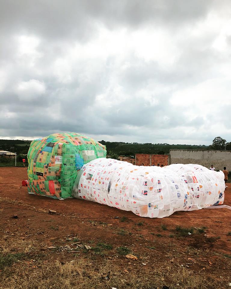 INFLAAMÁVEL, como carinhosamente chamamos esta primeira instalação pneumática, foi construída com mais de 2.000 sacolinhas plásticas de reuso, coletadas por nós, como também por voluntários. Ele foi colocado no campinho de futebol do bairro, para que todos os que passassem por lá pudessem interagir, especialmente as crianças.
