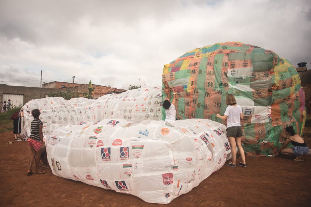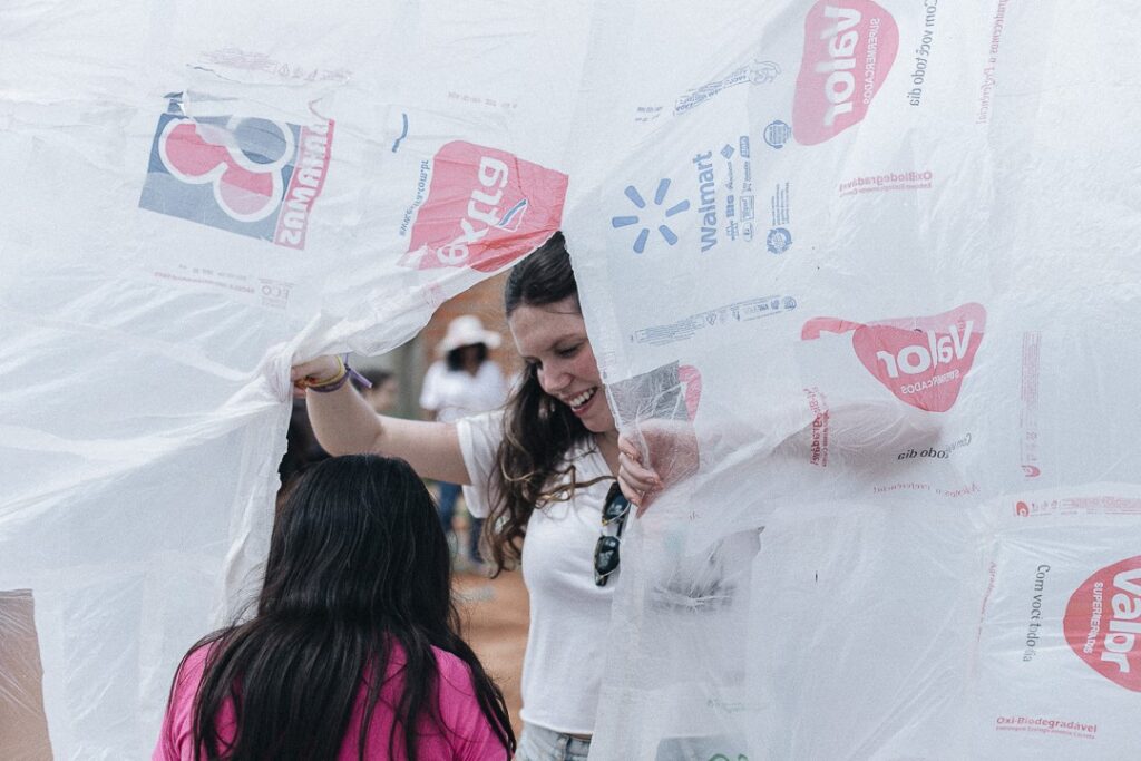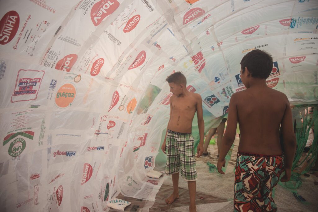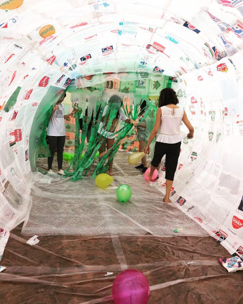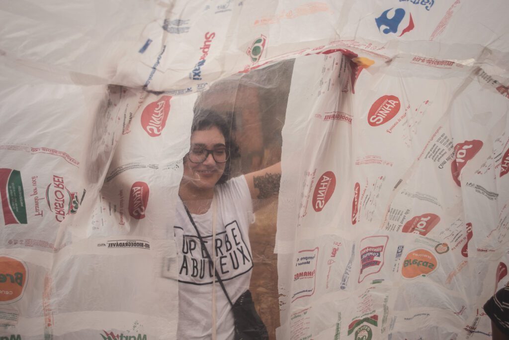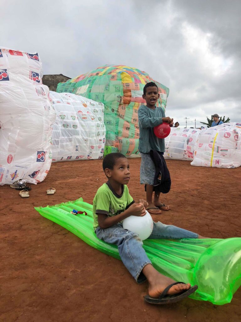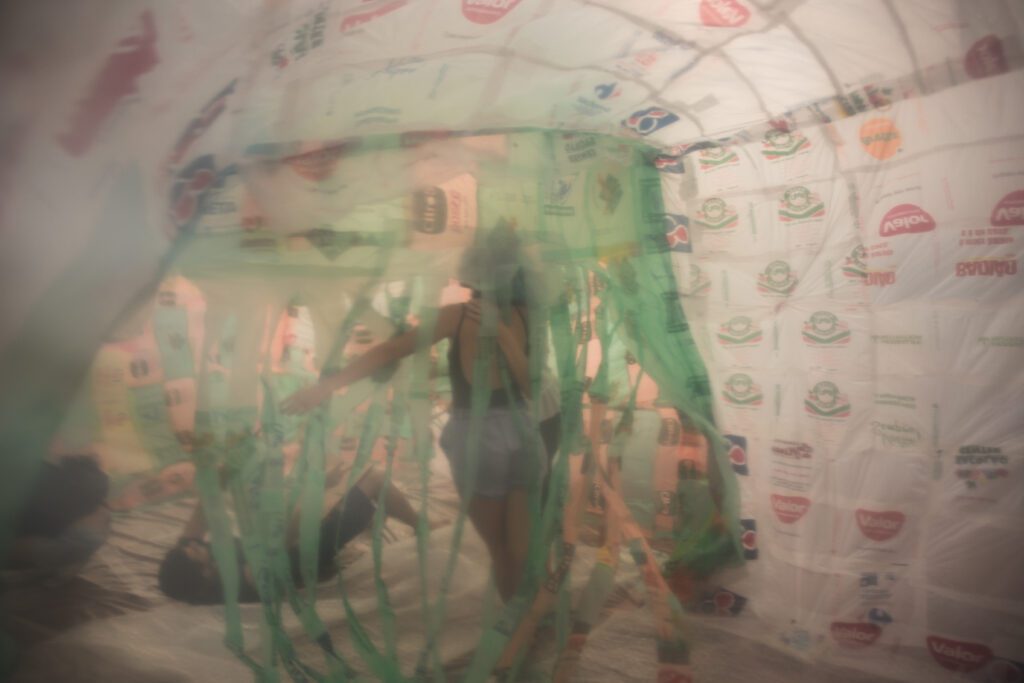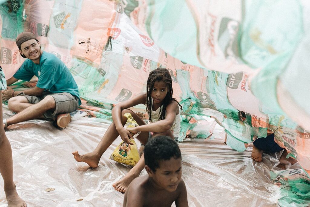 INFLAAMÁVEL, como carinhosamente chamamos esta primeira instalação pneumática, foi construída com mais de 2.000 sacolinhas plásticas de reuso, coletadas por nós, como também por voluntários. Ele foi colocado no campinho de futebol do bairro, para que todos os que passassem por lá pudessem interagir, especialmente as crianças.