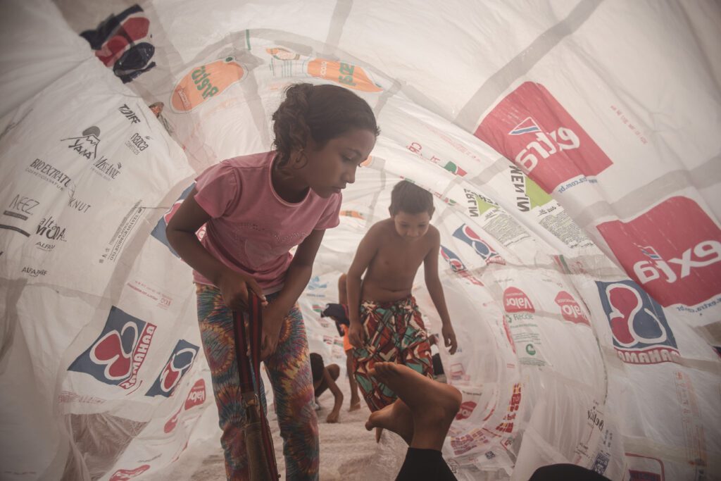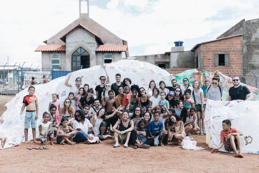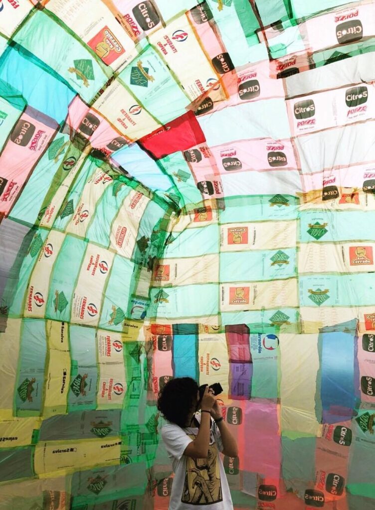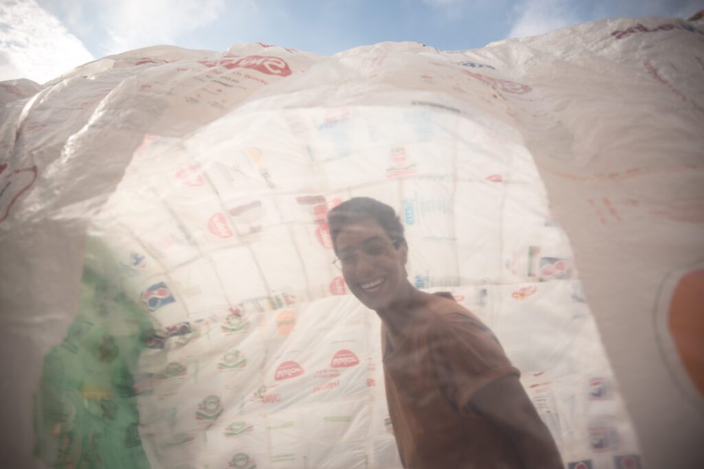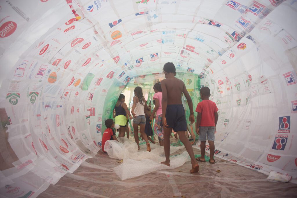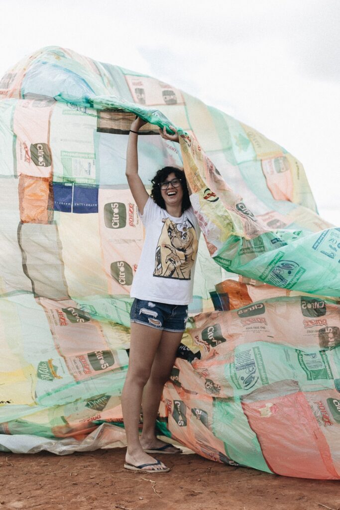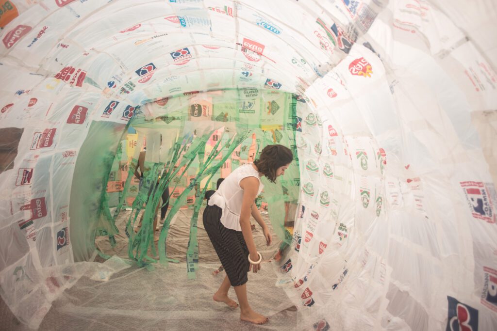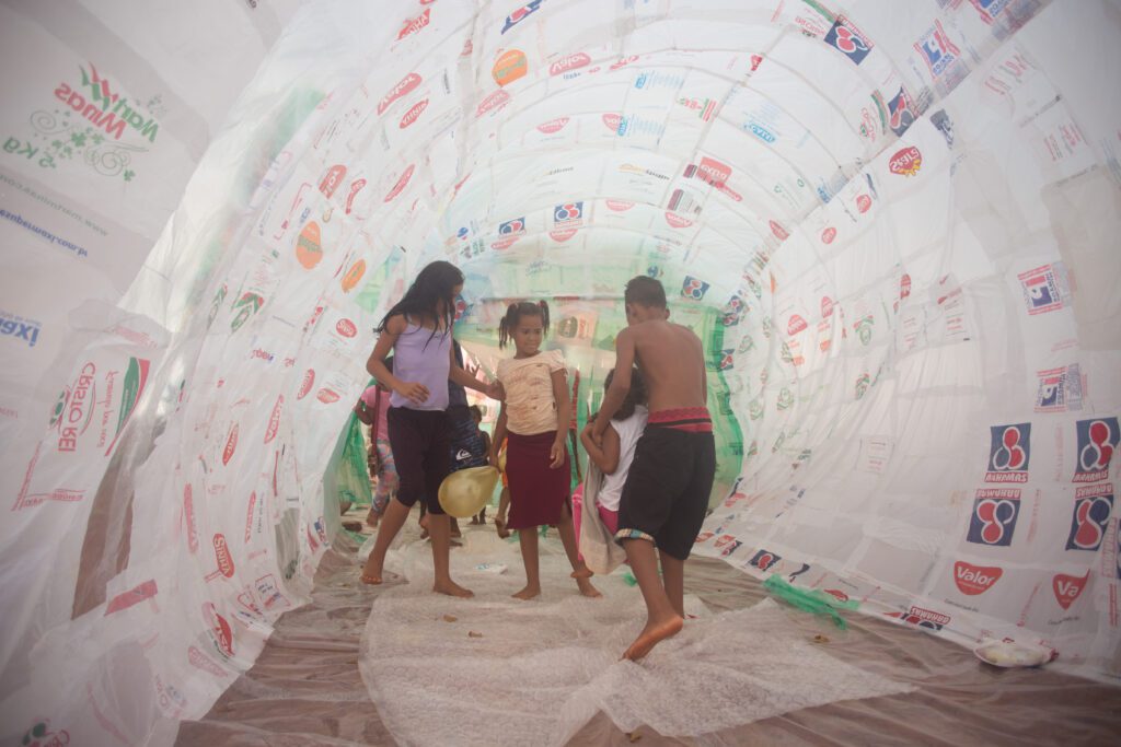 INFLAAMÁVEL, como carinhosamente chamamos esta primeira instalação pneumática, foi construída com mais de 2.000 sacolinhas plásticas de reuso, coletadas por nós, como também por voluntários. Ele foi colocado no campinho de futebol do bairro, para que todos os que passassem por lá pudessem interagir, especialmente as crianças.
