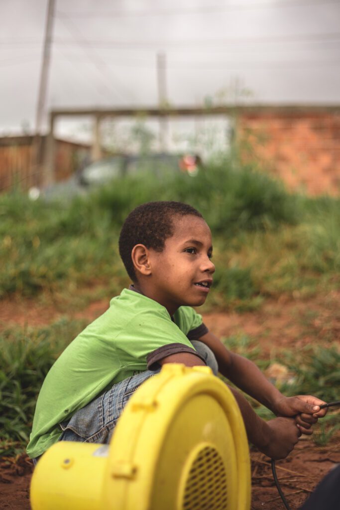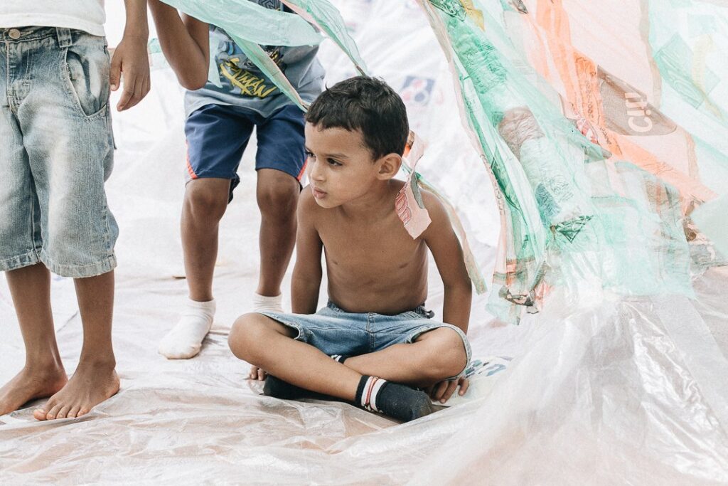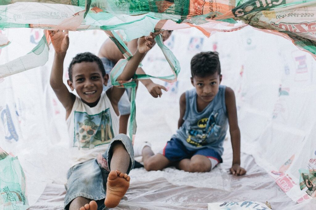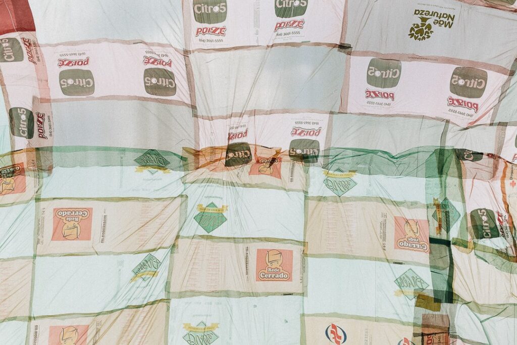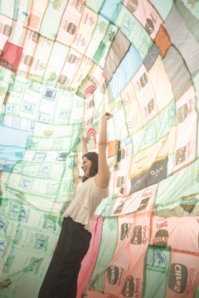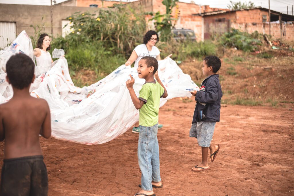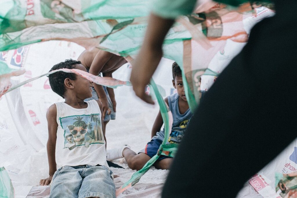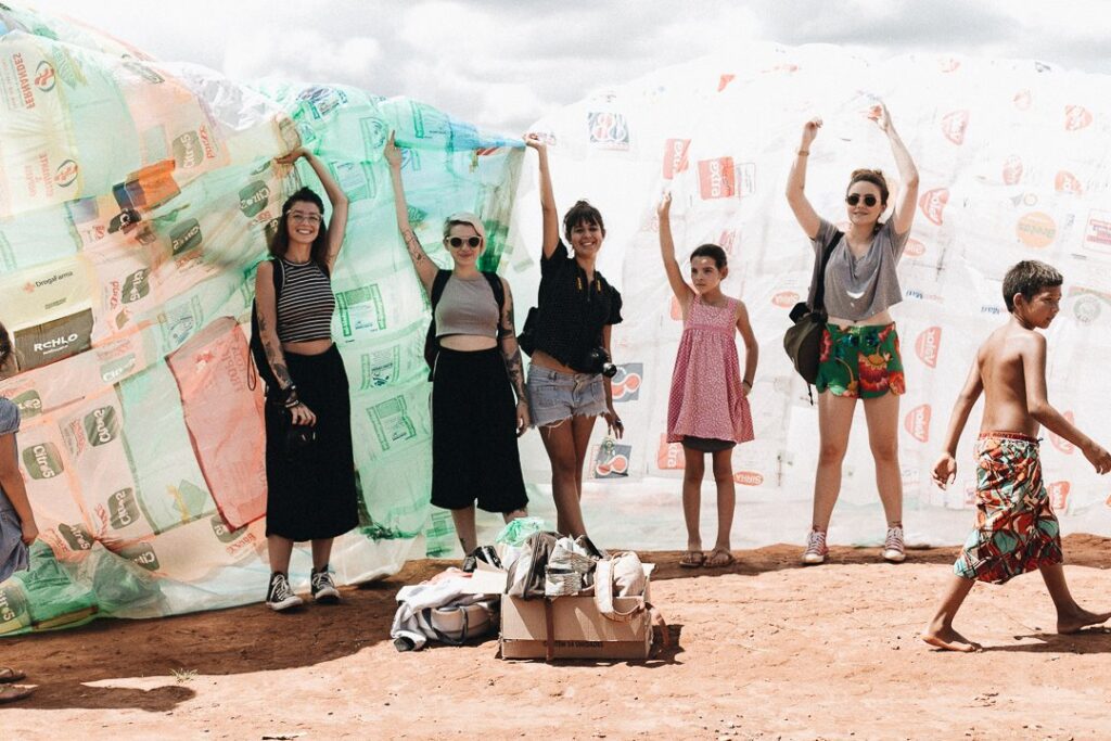 INFLAAMÁVEL, como carinhosamente chamamos esta primeira instalação pneumática, foi construída com mais de 2.000 sacolinhas plásticas de reuso, coletadas por nós, como também por voluntários. Ele foi colocado no campinho de futebol do bairro, para que todos os que passassem por lá pudessem interagir, especialmente as crianças.
