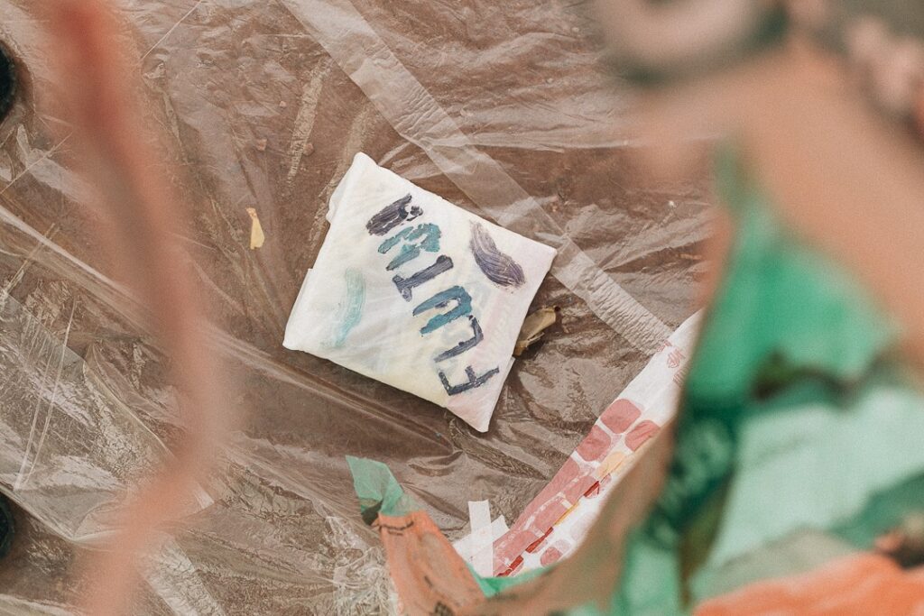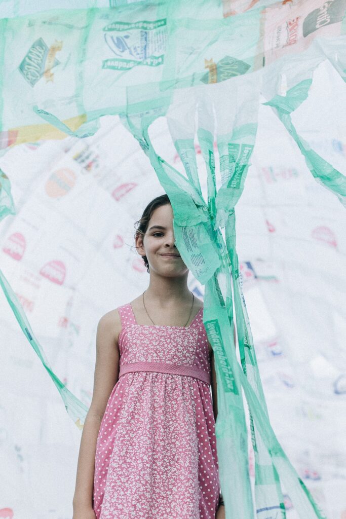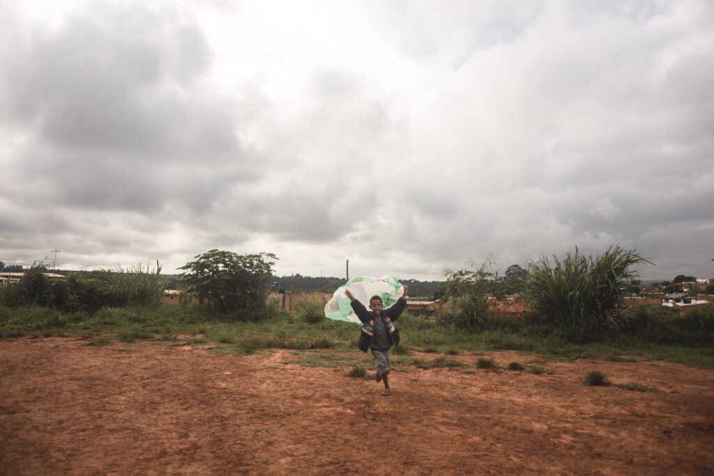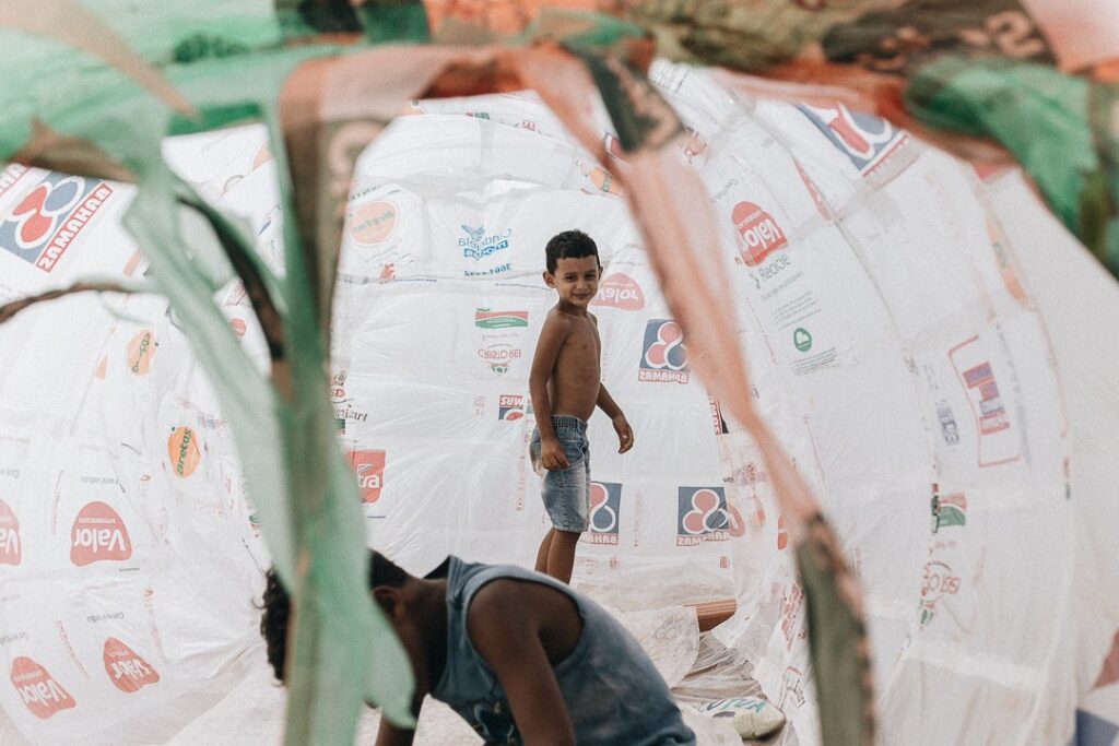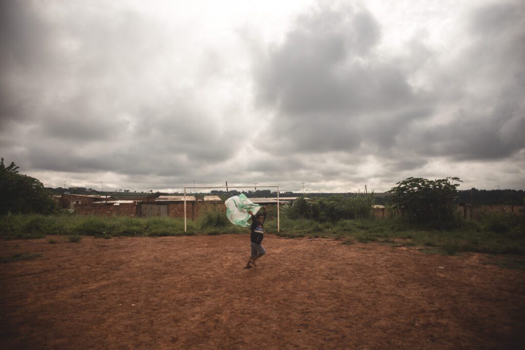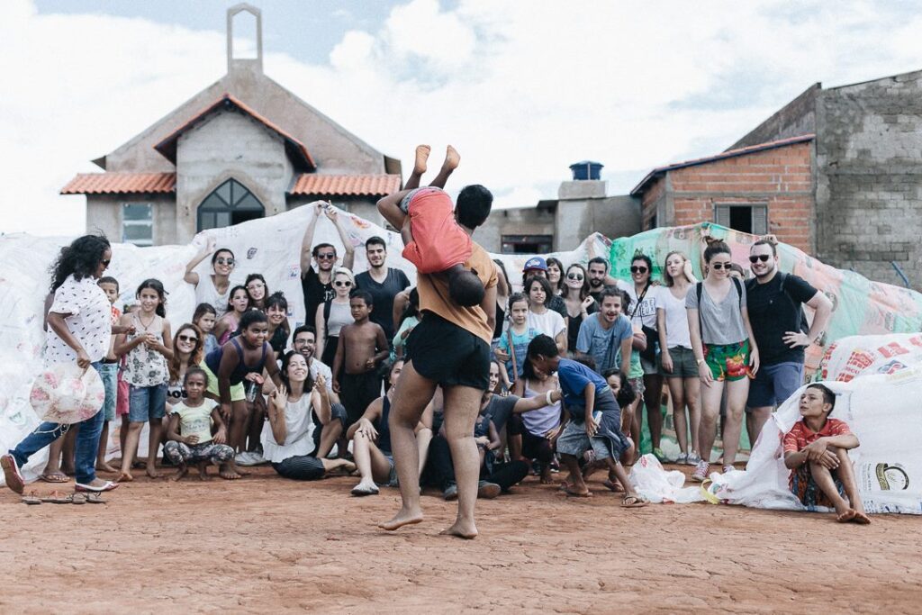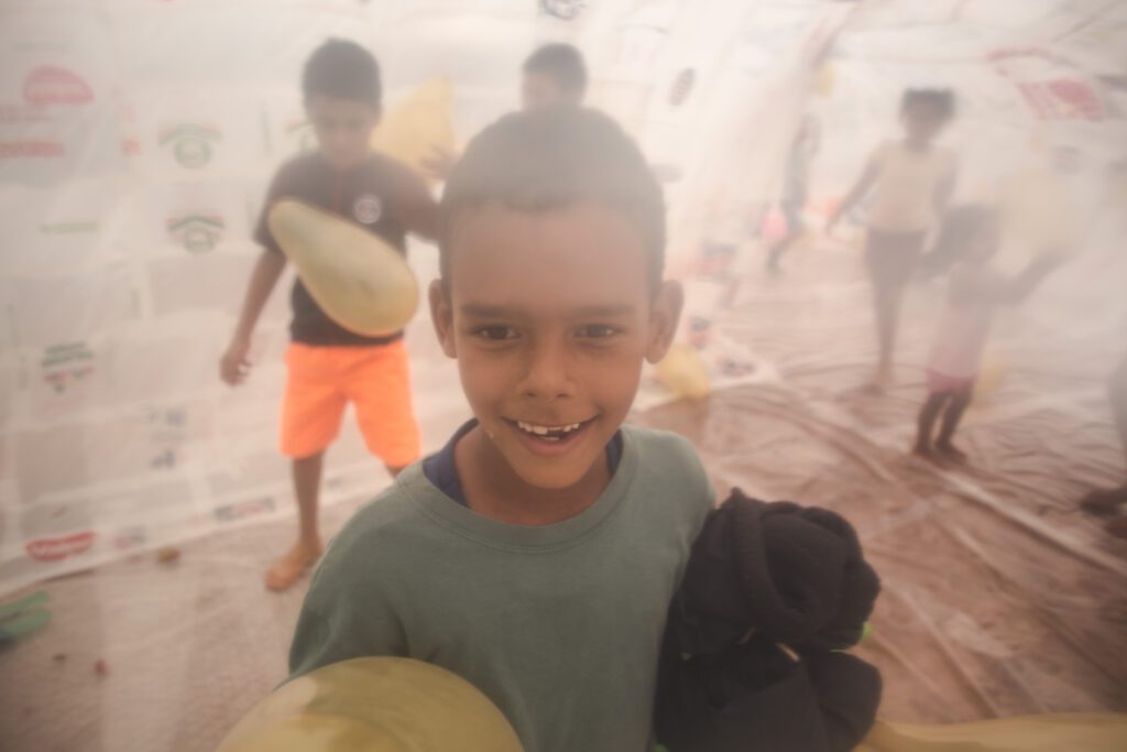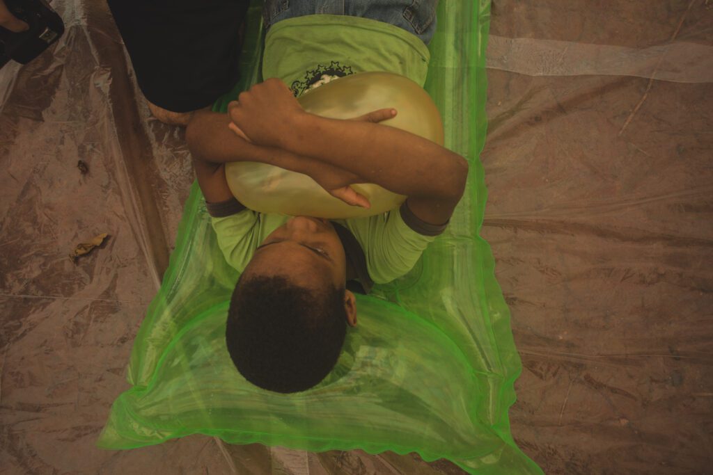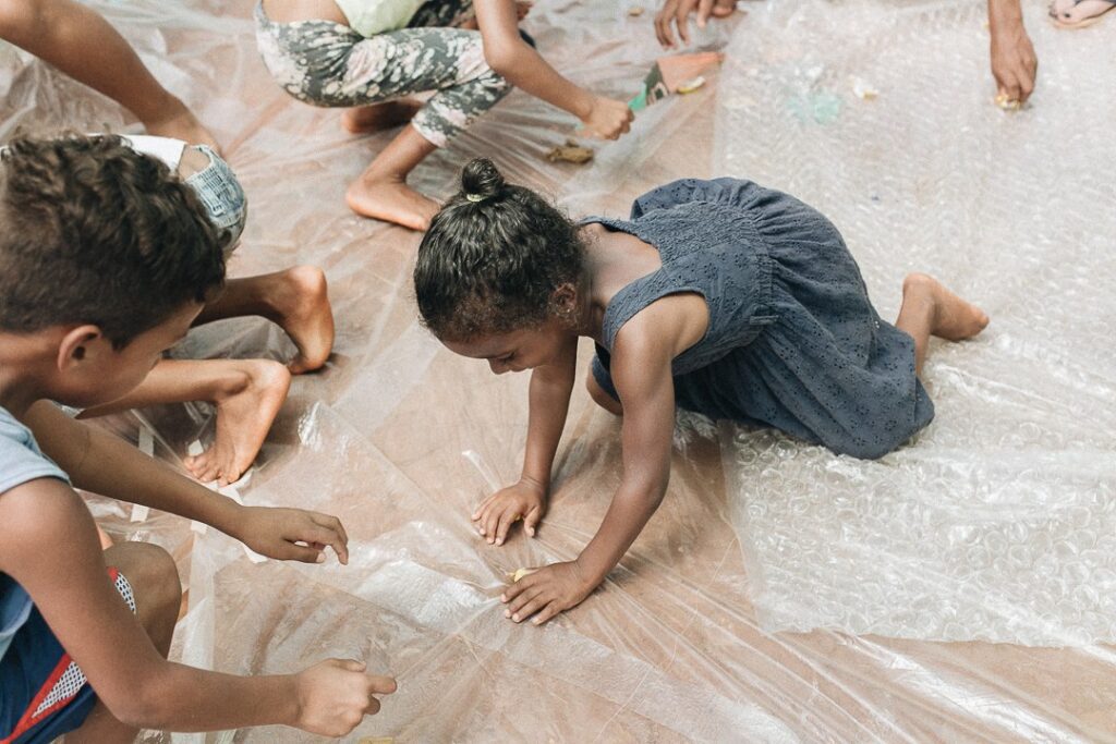 INFLAAMÁVEL, como carinhosamente chamamos esta primeira instalação pneumática, foi construída com mais de 2.000 sacolinhas plásticas de reuso, coletadas por nós, como também por voluntários. Ele foi colocado no campinho de futebol do bairro, para que todos os que passassem por lá pudessem interagir, especialmente as crianças.