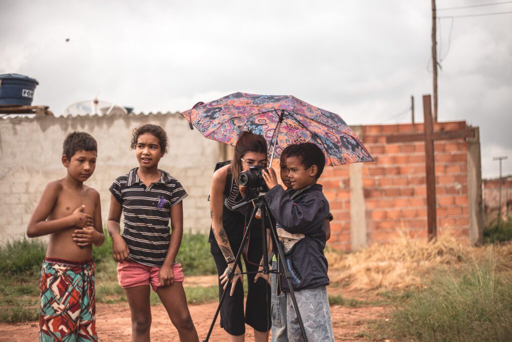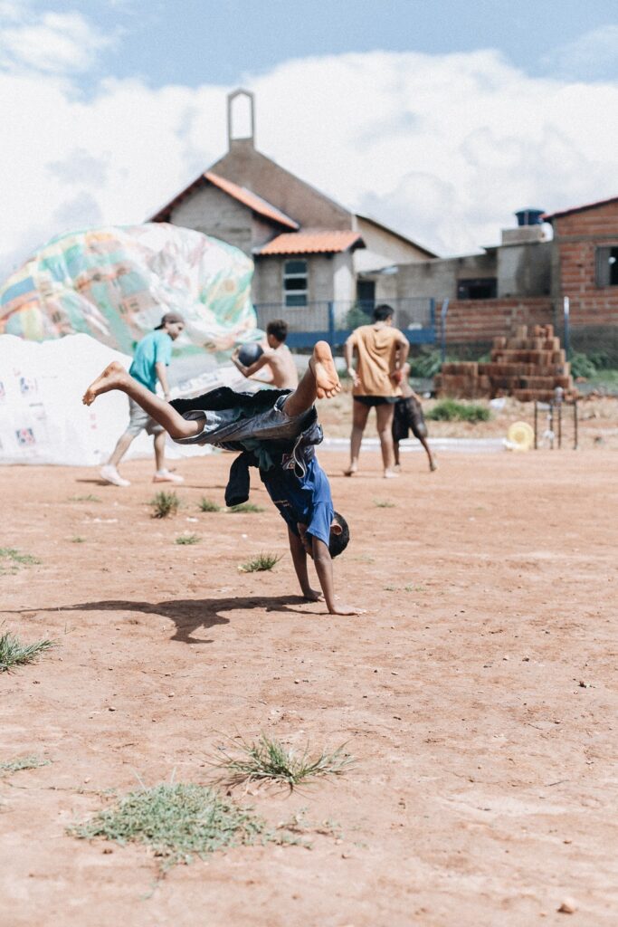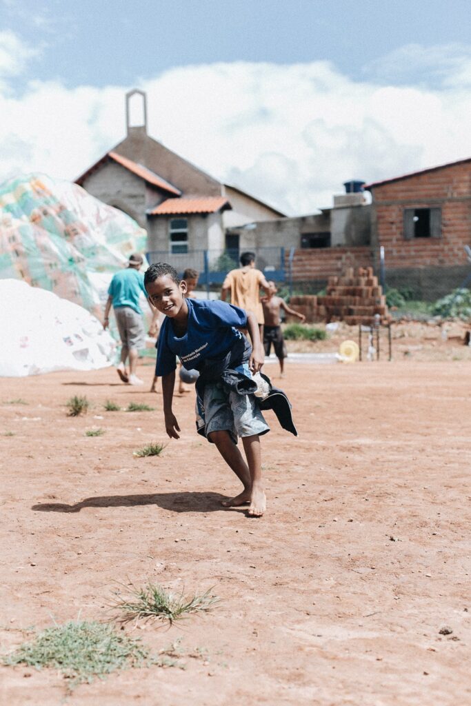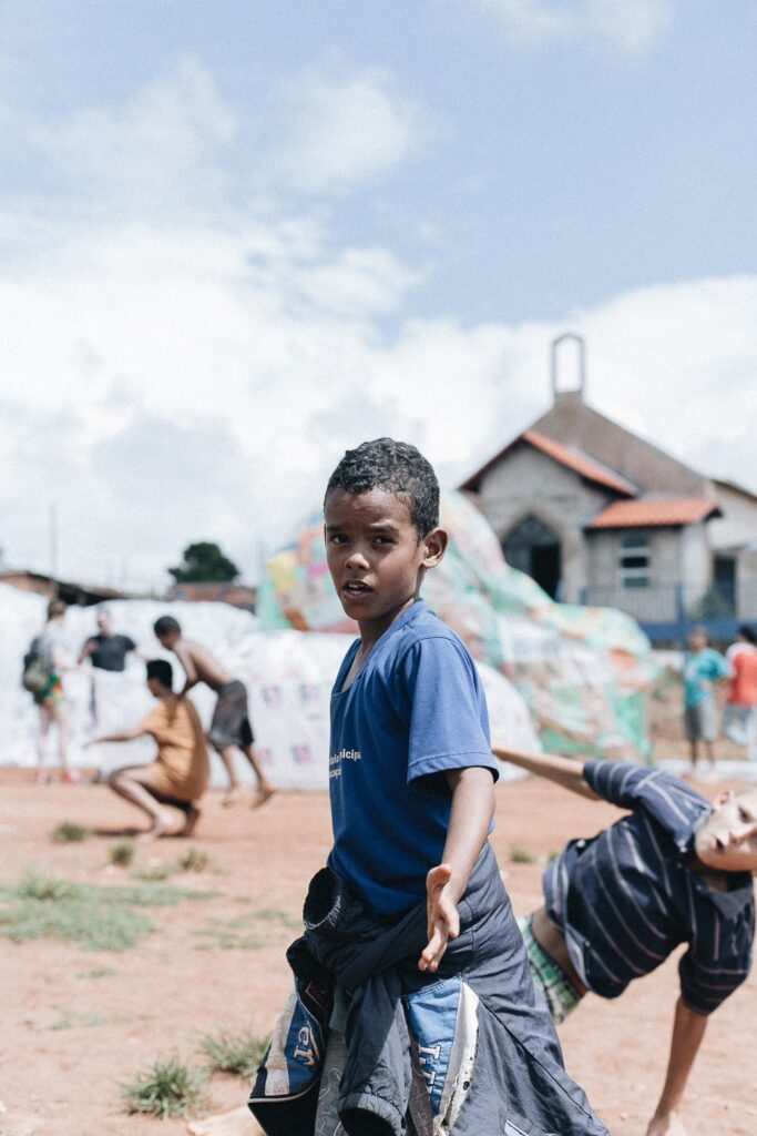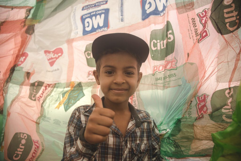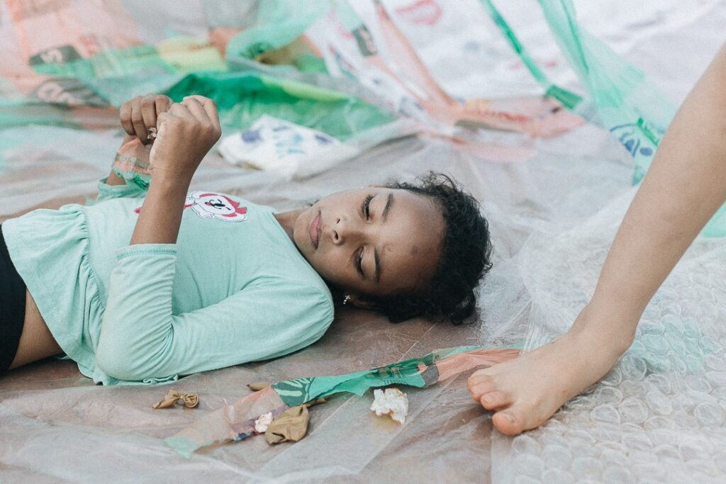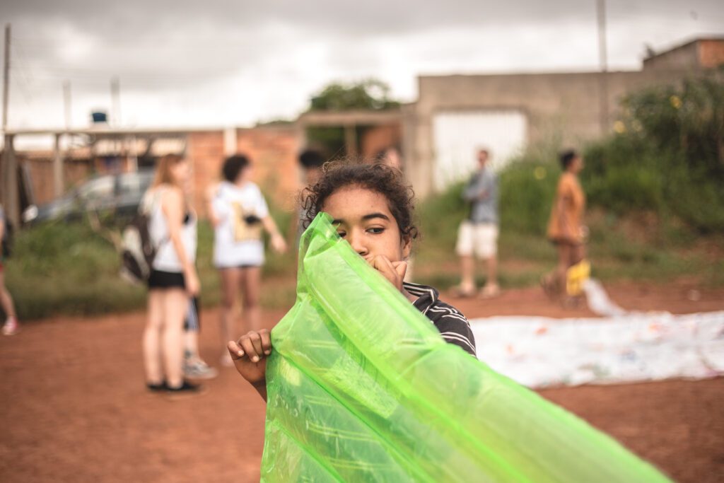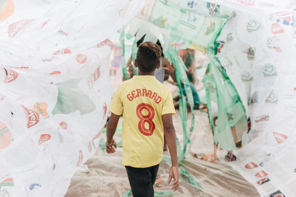INFLAAMÁVEL, como carinhosamente chamamos esta primeira instalação pneumática, foi construída com mais de 2.000 sacolinhas plásticas de reuso, coletadas por nós, como também por voluntários. Ele foi colocado no campinho de futebol do bairro, para que todos os que passassem por lá pudessem interagir, especialmente as crianças.