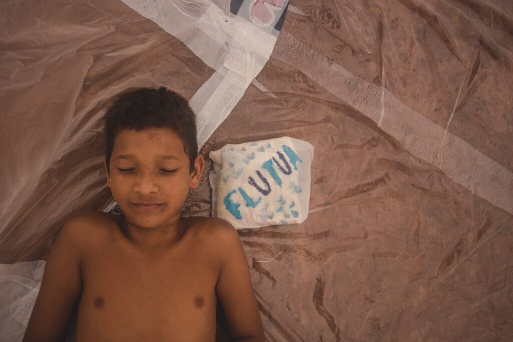 A primeira instalação FLUTUA foi feita no bairro Élisson Prieto, em Uberlândia, também conhecido como ocupação do Glória. O convite para a atividade foi feito pelas amigas do Projeto ABC do Glória: Ana Cecília Vera, Amanda Figueira e Isabella Martins, que coordenavam a iniciativa de apoio às crianças e aos jovens do local.