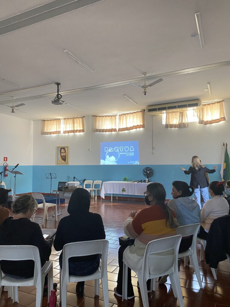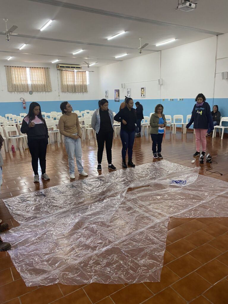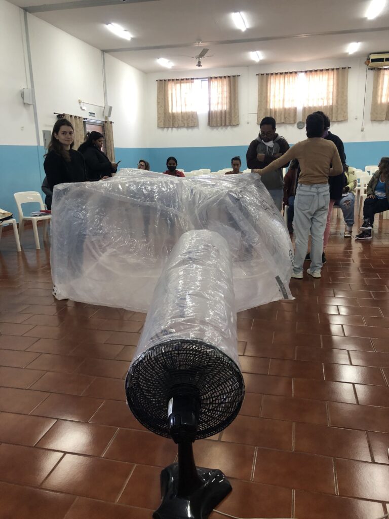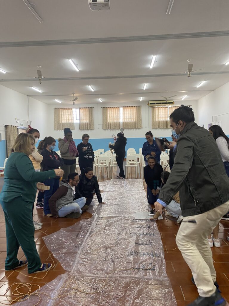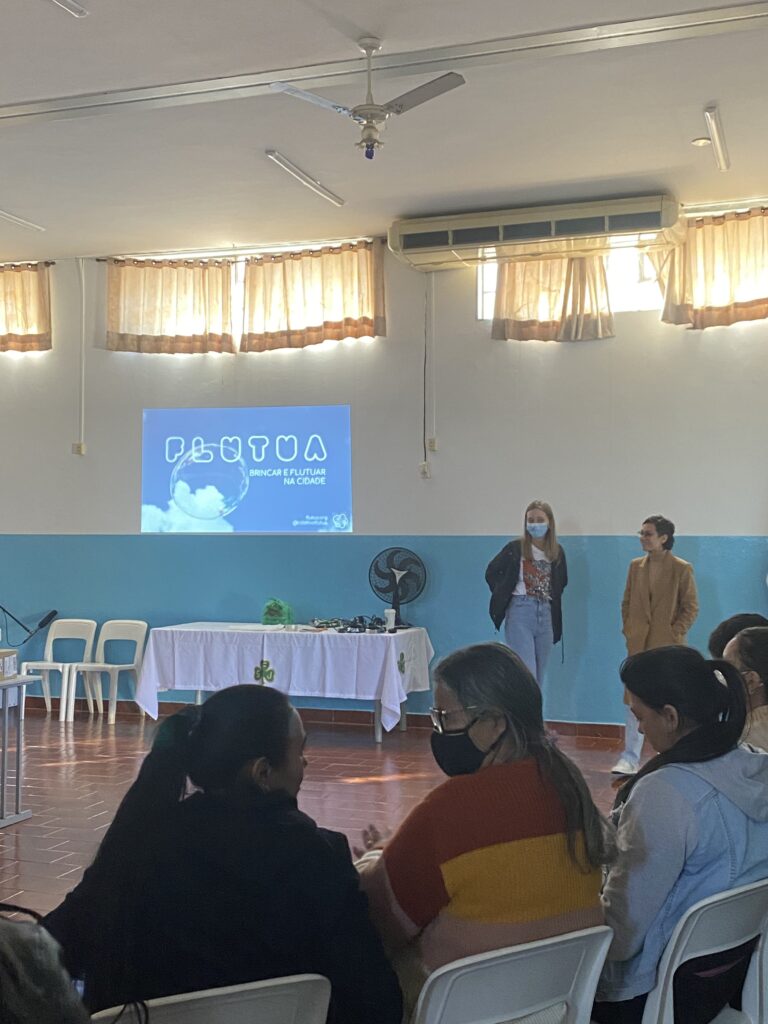 Na oficina, que antecedeu a contação de histórias performada pelo ator Eduardo Gasperin, FLUTUA esteve com a equipe do Centro Educacional Maria de Nazaré para compartilhar suas vivências e ampliar o repertório da equipe no que tange à educação urbanística, ambiental e artística. Após uma breve apresentação das ações e propósito do coletivo e troca de ideias, foi construída uma cabaninha inflável para que os participantes pudessem sentir a experiência FLUTUA.