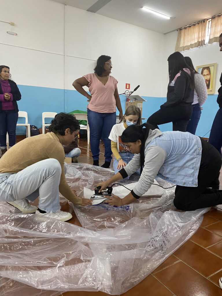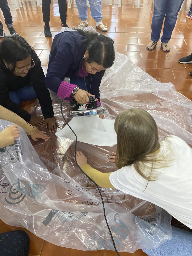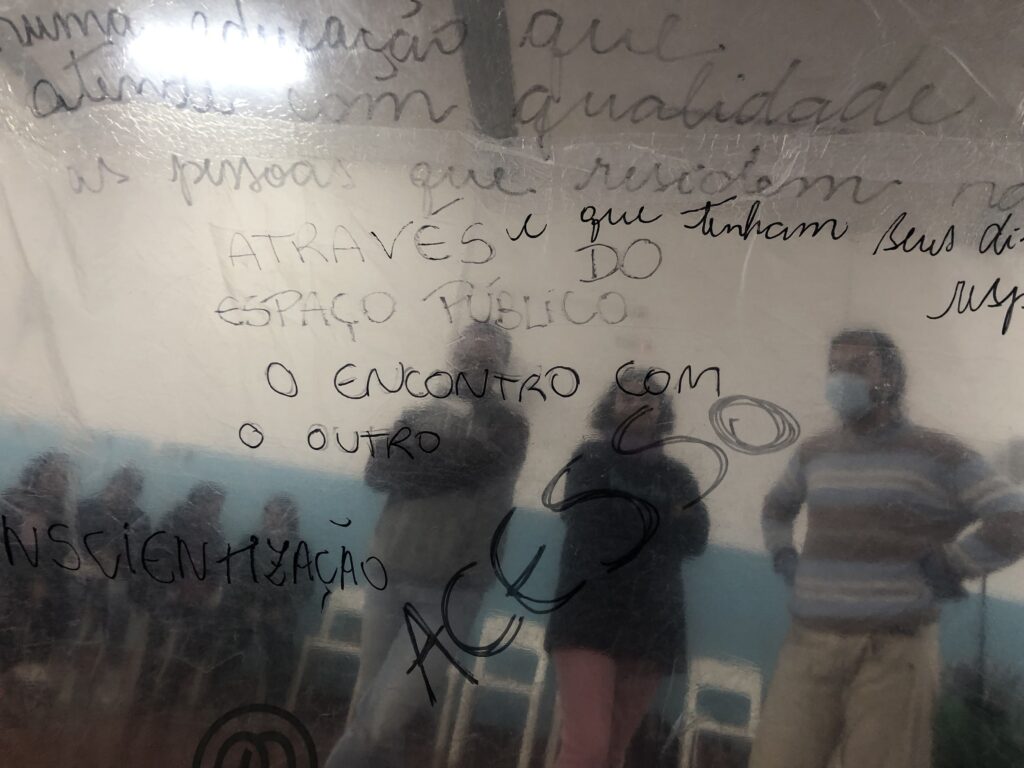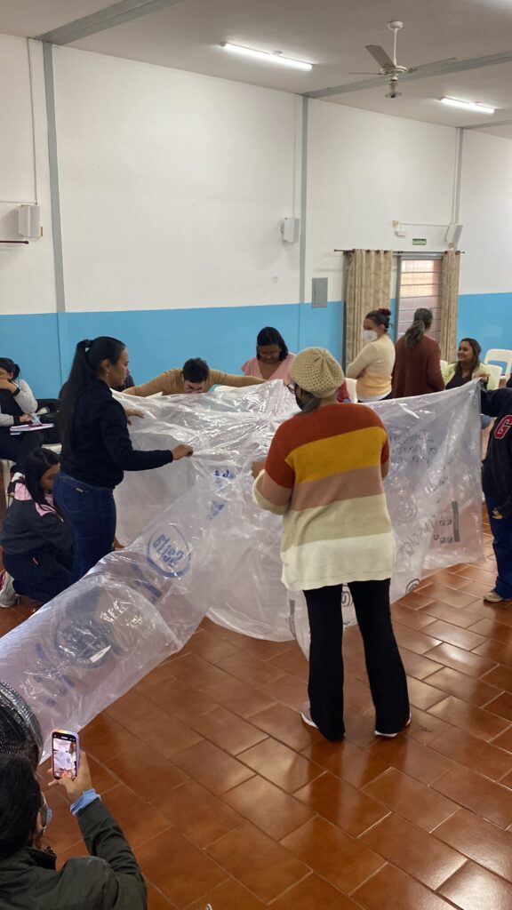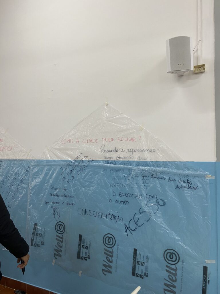 Na oficina, que antecedeu a contação de histórias performada pelo ator Eduardo Gasperin, FLUTUA esteve com a equipe do Centro Educacional Maria de Nazaré para compartilhar suas vivências e ampliar o repertório da equipe no que tange à educação urbanística, ambiental e artística. Após uma breve apresentação das ações e propósito do coletivo e troca de ideias, foi construída uma cabaninha inflável para que os participantes pudessem sentir a experiência FLUTUA.