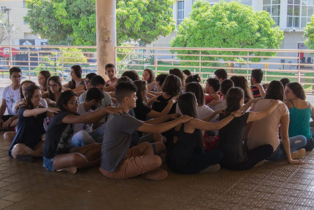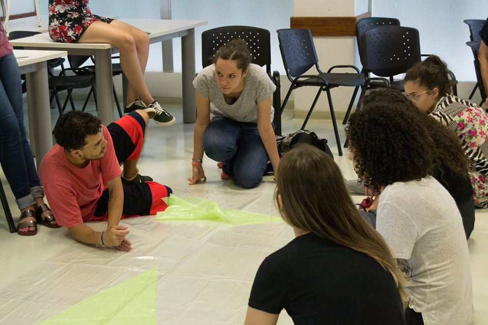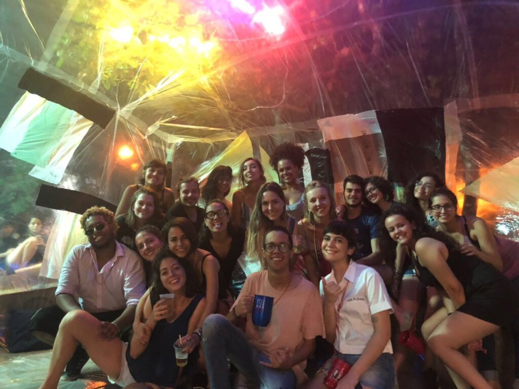 Para começar, propusemos uma atividade de aproximação dos participantes da turma, já que estavam estabelecendo os primeiros contatos naquele momento. Deixamos que o corpo e a arquitetura fossem experimentados nessa interação. Logo após, demos início à construção do inflável, previamente projetado por nós e finalizado pelos novates.