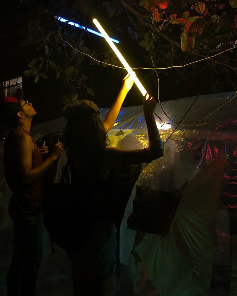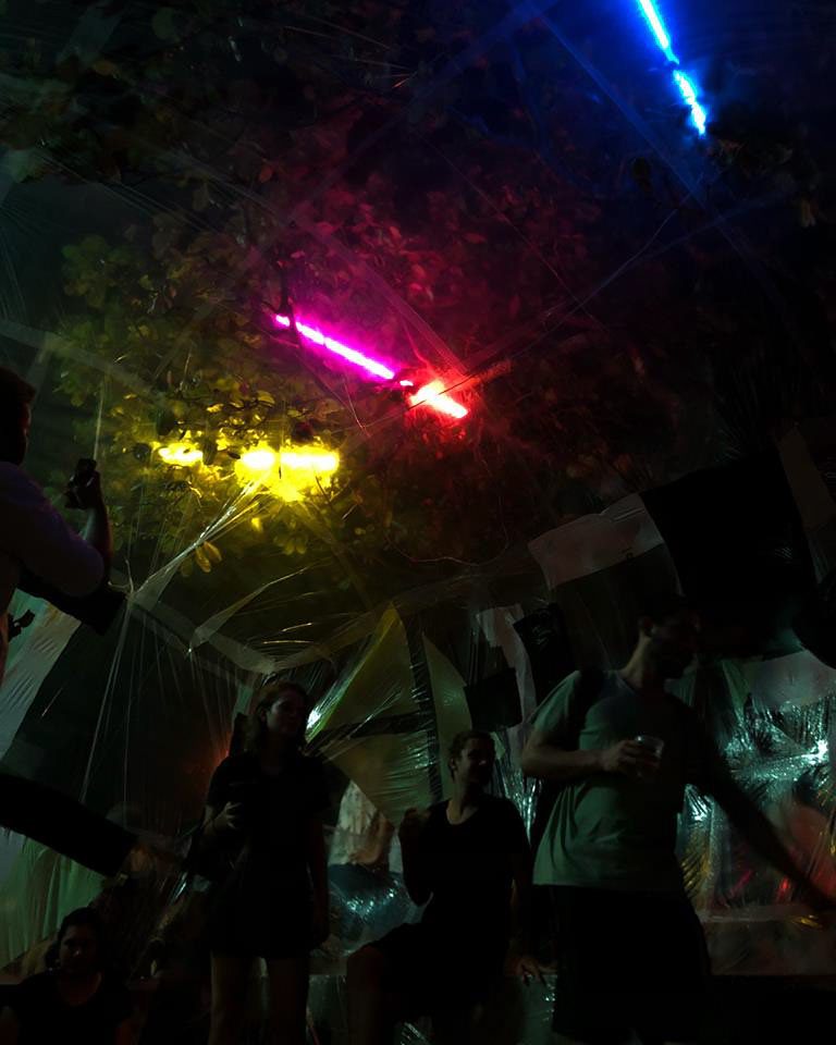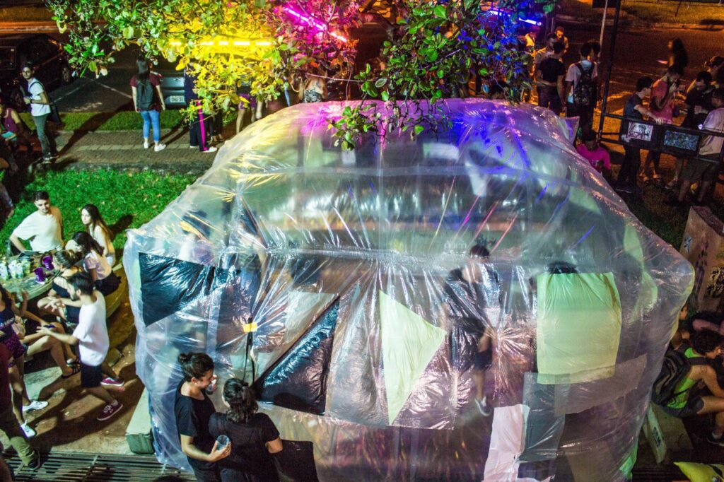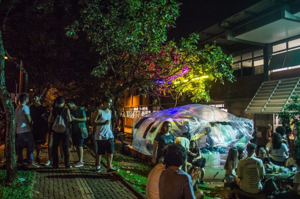 A sua execução foi feita com sacos plásticos reciclados e aconteceu durante uma tarde inteira. Ao final do dia, alocamos o objeto-ambiente no Diretório Acadêmico da própria Faculdade de Arquitetura e Urbanismo da UFU (DALAU), onde acontecia uma festa aberta aos universitáries.