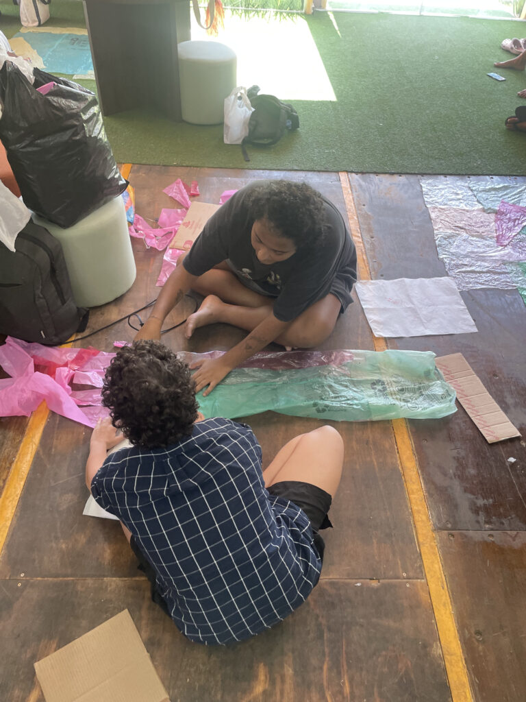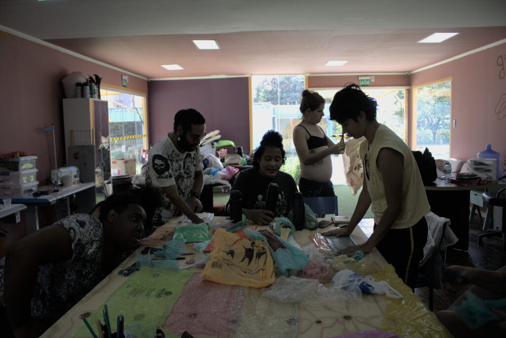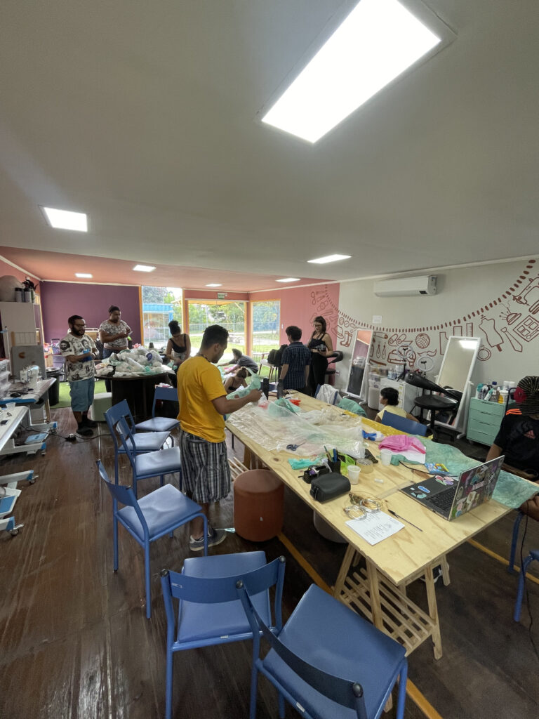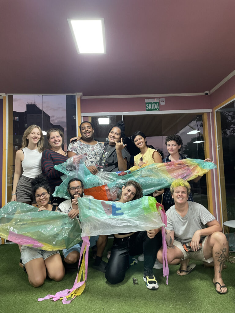 Iniciamos o dia apresentando nossa trajetória e discutindo aspectos essenciais do trabalho com resíduos plásticos: desde o planejamento de um projeto até a planificação e o manuseio de diferentes formas. A manhã se encerrou com a produção de birutas feitas a partir de sacolas reutilizadas.