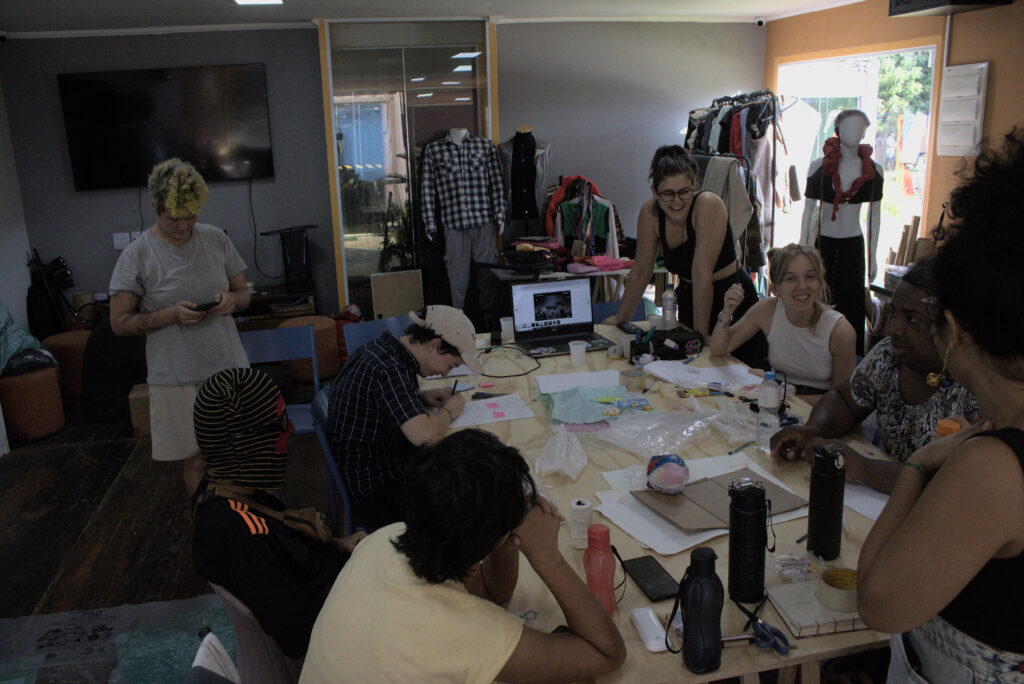 À tarde, mergulhamos nos desejos e planos da companhia para a cenografia e descobrimos que sua intenção era criar uma grande biruta em forma de cobra, que ganharia vida com os movimentos dos atuantes. A partir dessa ideia, passamos o restante do dia projetando maneiras de transformar essa visão em realidade e desenvolvemos um protótipo.